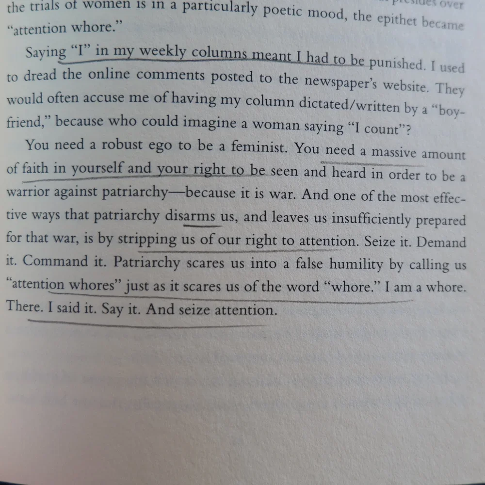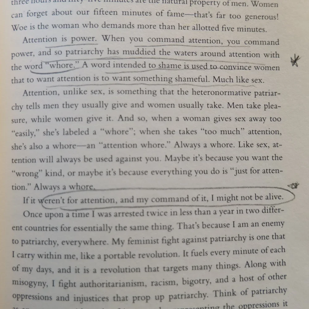 “Attention is power. When you command attention, you command power, so patriarchy has muddied the waters around attention with “whore.” A word intended to shame is used to convince women that to want attention is to want something shameful. Much like sex.”