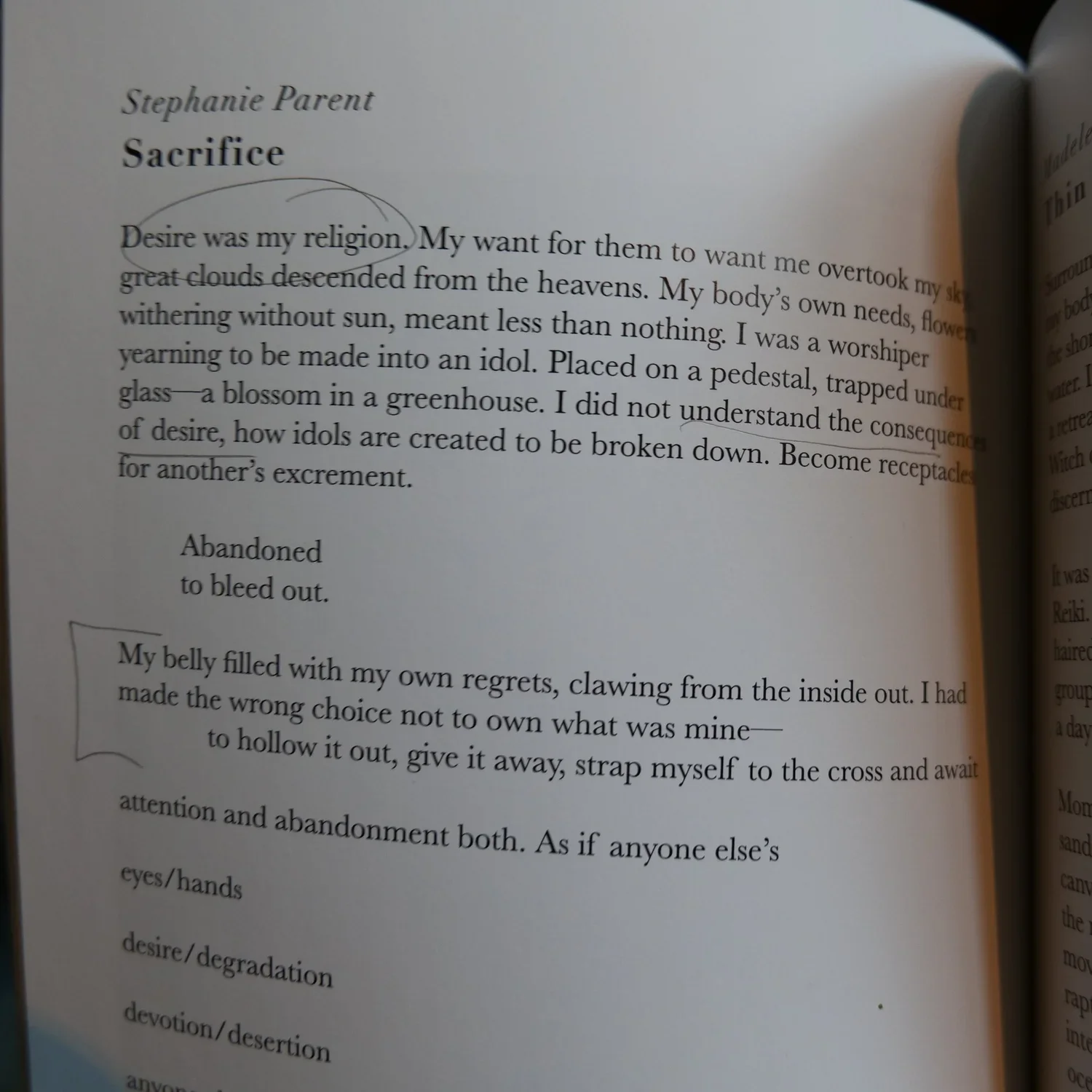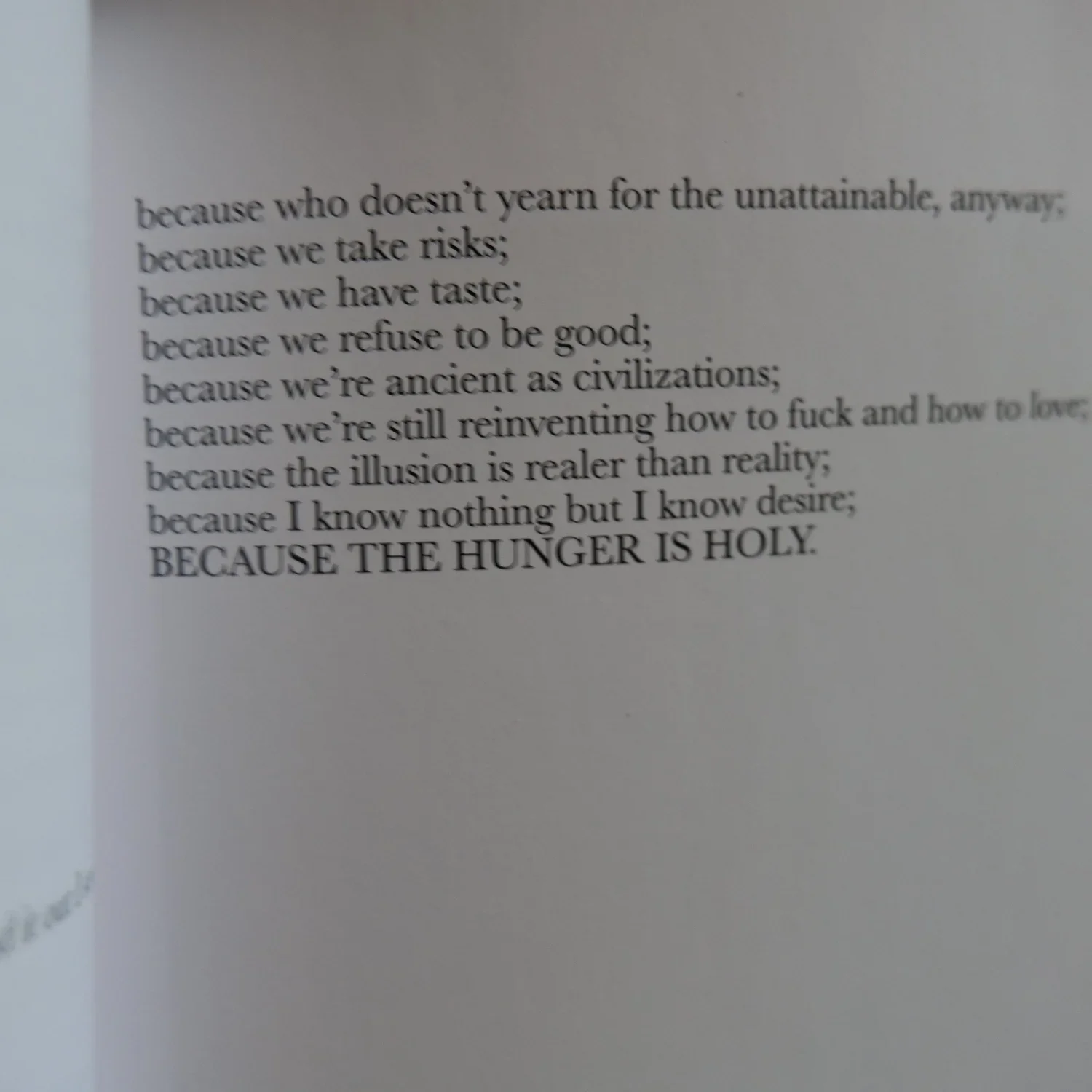 Desire is the body responding to its divine inheritance, to the calling that separated it from the anonymity and birthed it into its individual form on earth. It’s this life-force of the soul, pushing against the stiffened body, urging it to travel back towards the territory of sin, where all desires lay disguised as contradictions, and where the body tasted its first danger and learned quickly and well how to stay far.